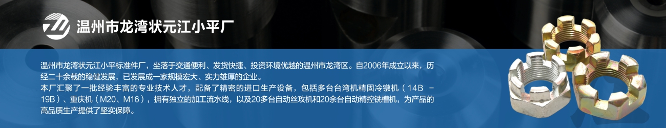 溫州市龍灣狀元江小平標準件廠,坐落于交通便利、發(fā)貨快捷、投資環(huán)境優(yōu)越的溫州市龍灣區(qū)。自 2006 年成立以來,歷經(jīng)二十余載的穩(wěn)健發(fā)展,已發(fā)展成一家規(guī)模宏大、實力雄厚的企業(yè)。 本廠匯聚了一批經(jīng)驗豐富的專業(yè)技術人才,配備了精密的進口生產(chǎn)設備,包括多臺臺灣機精固冷鐓機(14B - 19B)、重慶機(M20、M16),擁有獨立的加工流水線,以及 20 多臺自動絲攻機和 20 余臺自動精控銑槽機,為產(chǎn)品的高品質(zhì)生產(chǎn)提供了堅實保障。 公司主營產(chǎn)品種類豐富,涵蓋槽型開花螺母(M6 - M24)、槽型開花法蘭螺母、螺絲刀配件、球殼等,并承接各類非標螺母標準件的定制生產(chǎn),能夠滿足不同客戶的多樣化需求。 多年來,我廠始終秉持 “客戶至上、品質(zhì)卓越、價格合理、交貨便捷” 的經(jīng)營理念,以熱忱周到的服務贏得了廣大客商的高度認可與信賴,推動了企業(yè)的持續(xù)發(fā)展與壯大。在此,向廣大客戶致以衷心的感謝,感謝您們長期以來的支持與厚愛! 我們熱忱歡迎各位客商蒞臨指導,來圖、來電洽談合作,攜手共創(chuàng)美好未來!