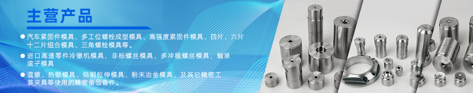 主導產品有:①汽車緊固件模具、多工位螺栓成型模具、高強度緊固件模具、四片、六片、十二片組合模具、三角螺栓模具等。②進口高速零件冷鐓機模具。③溫鐓、熱鍛模具、鎢鋼拉伸模具、粉末冶金模具、及其它精密工裝夾具等使用的精密備品備件。